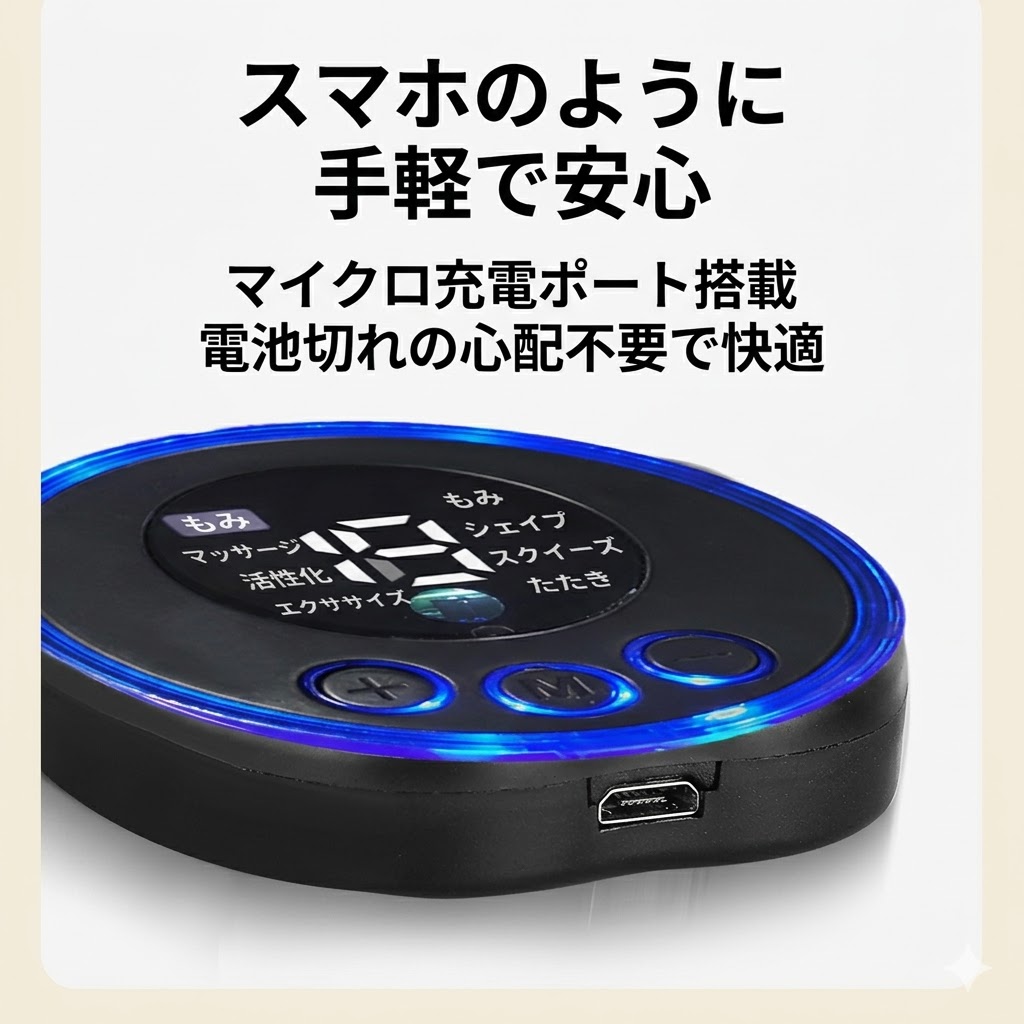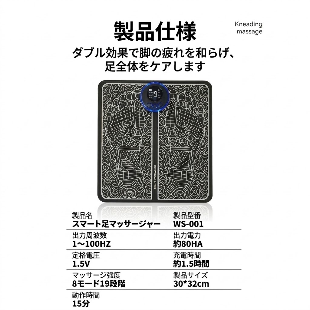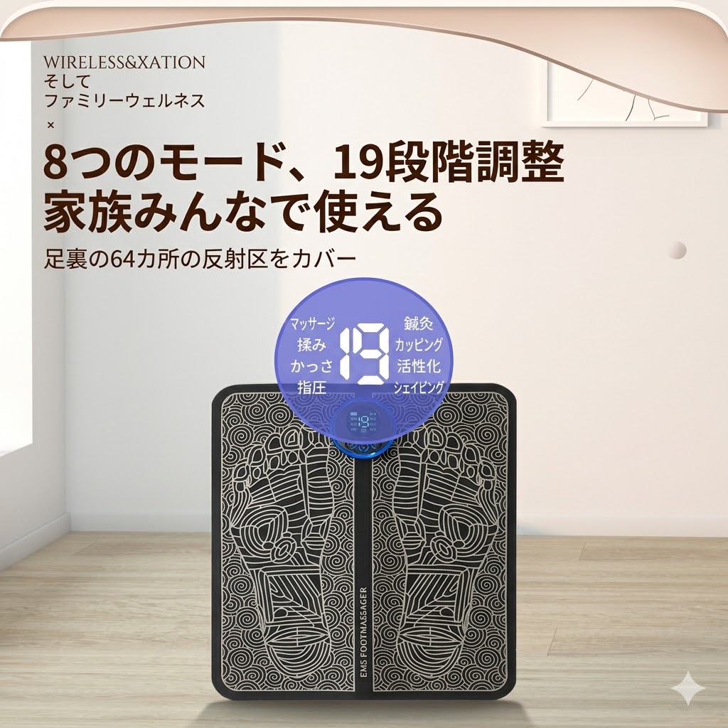 EMS 低周波刺激:足裏のツボに EMS 微電流を届け、筋肉をほぐして血行を促進。疲れやむくみを緩和します。