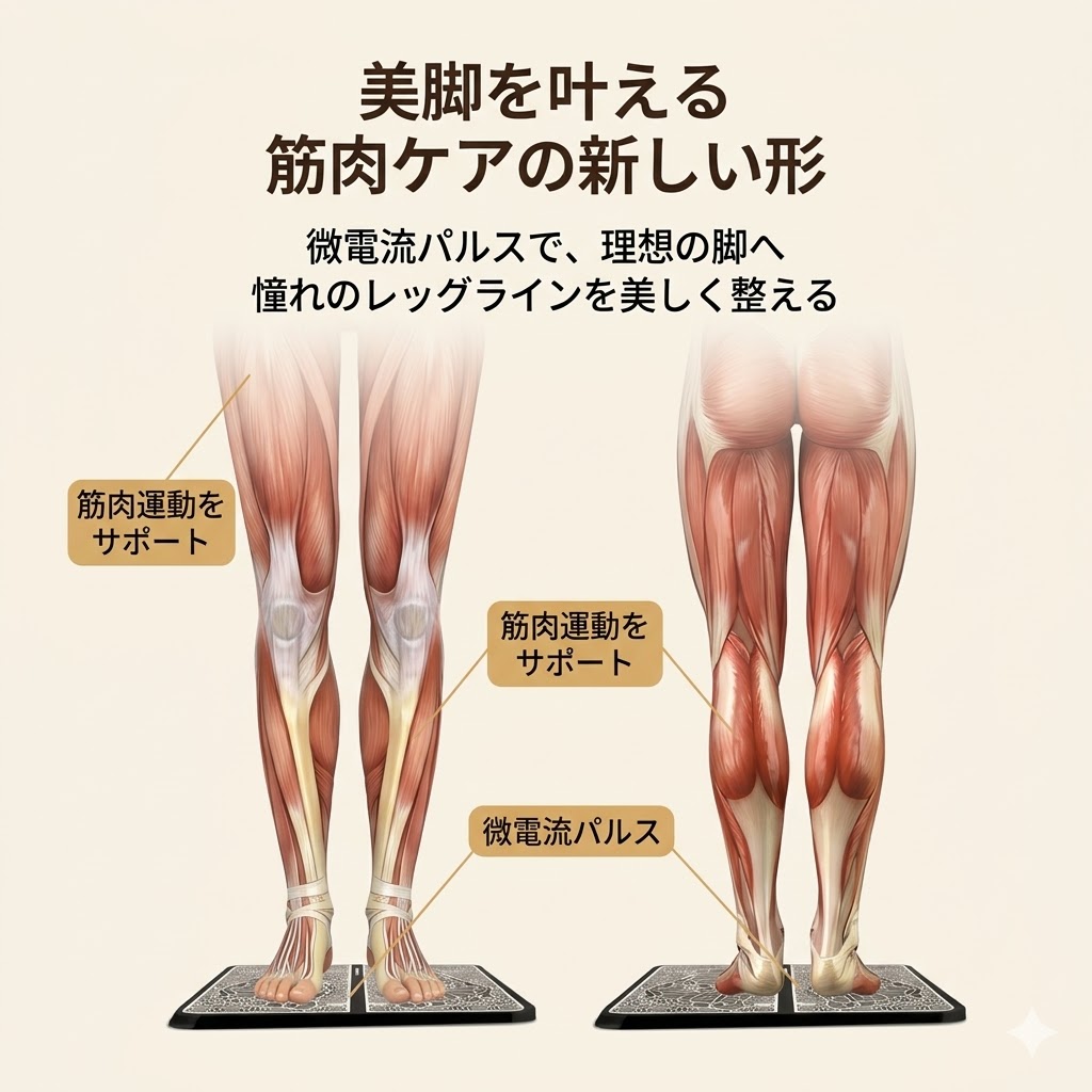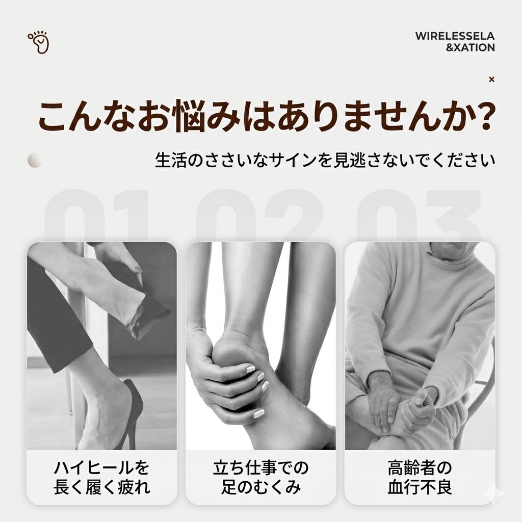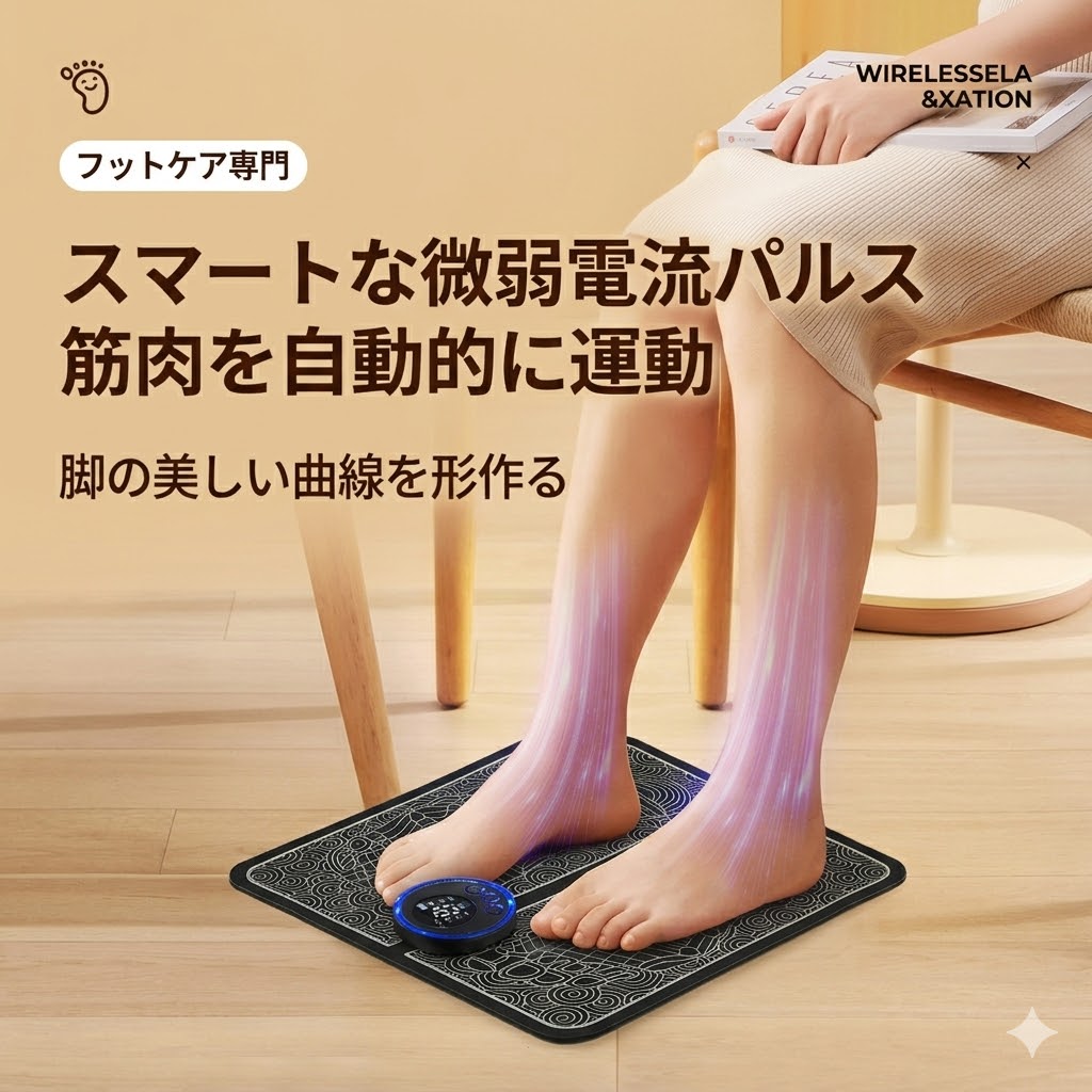 疲れた足に EMS で 1 日 15 分の新たな癒し体験を。簡単「ながら」ケアで、忙しい毎日でも手軽に足元の疲れをケアできます。