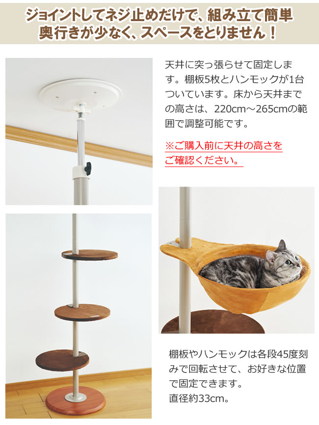 ・今までにない、まったく新しいタイプのキャットツリーです。ジョイントしてネジ止めだけで、組み立て簡単。奥行きが少なく、スペースをとりません。