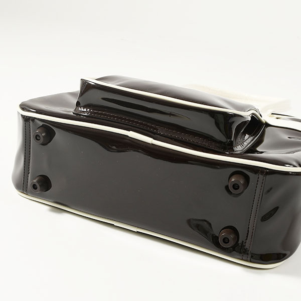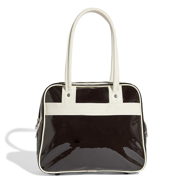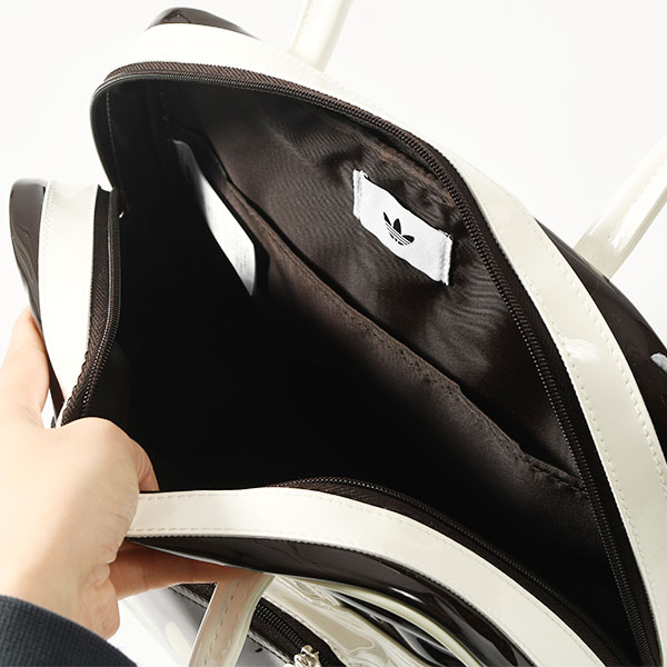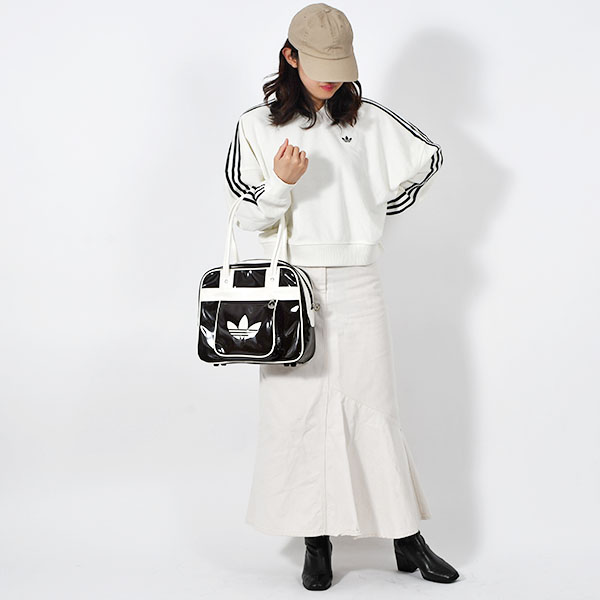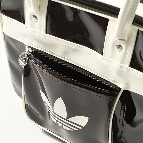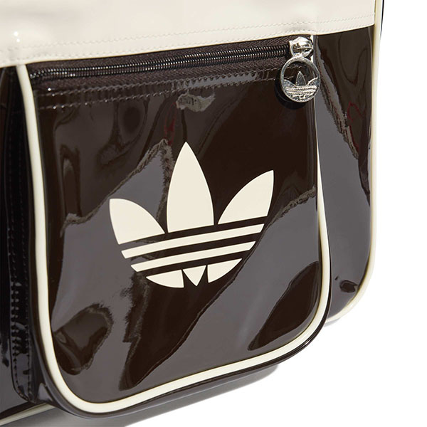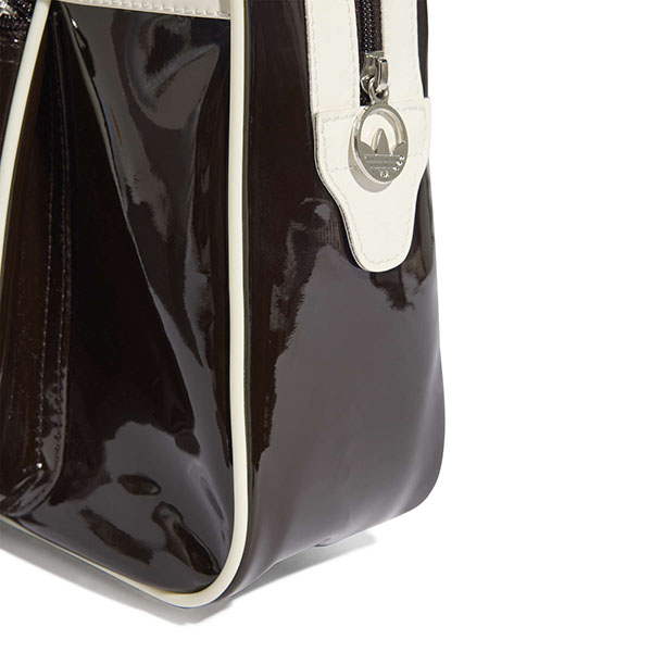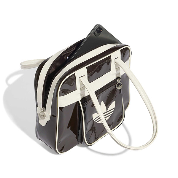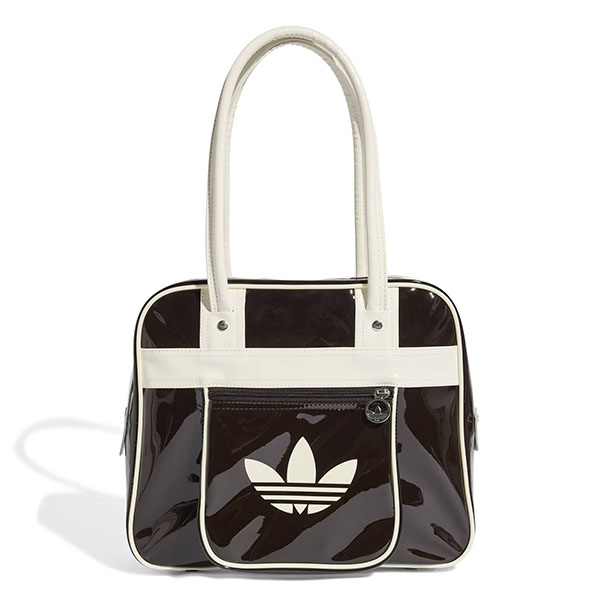 パテント素材を使用し、スタイリッシュで光沢のある作りに。アイコニックなトレフォイルのブランディングが存在感を添える。長めのハンドルで肩掛けしやすく、街で過ごす時間やカジュアルな集まりにも適している。