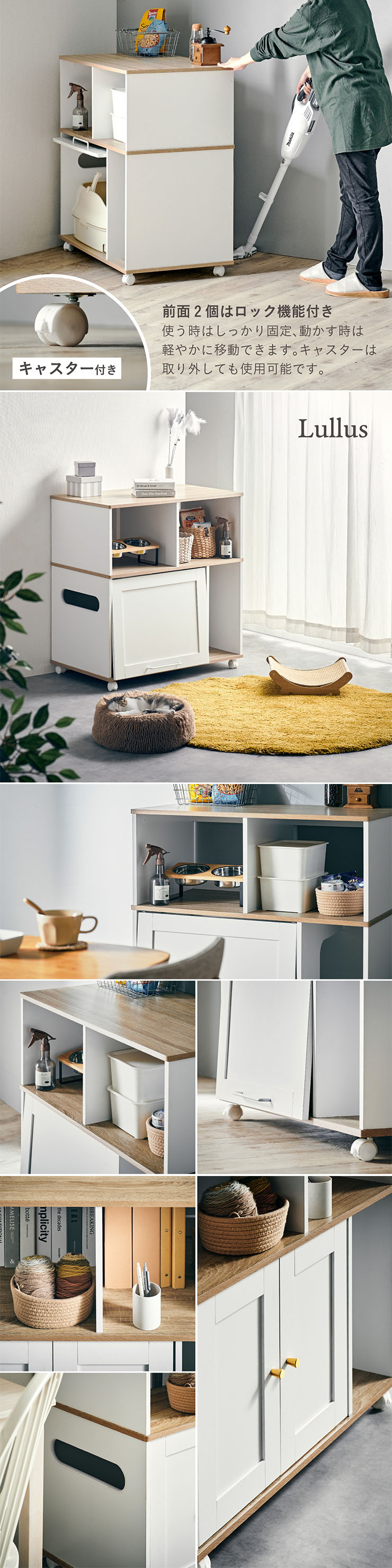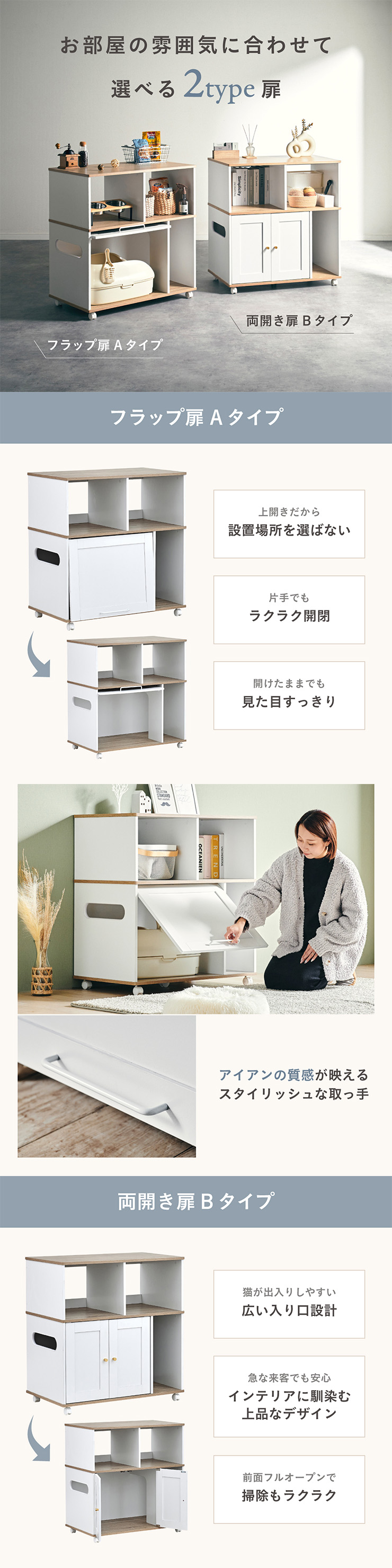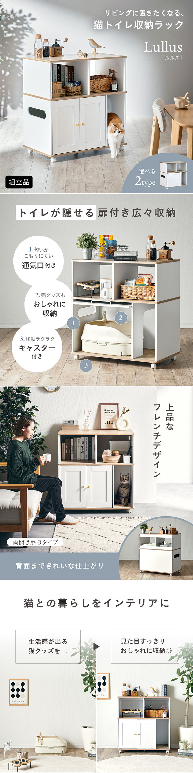 猫 トイレ 隠し キャビネット 家具 キャスター付き おしゃれ フラップ扉 両開き 猫砂 飛び散り防止 猫トイレ収納ラック Lullus(ルルス) 2タイプ対応
