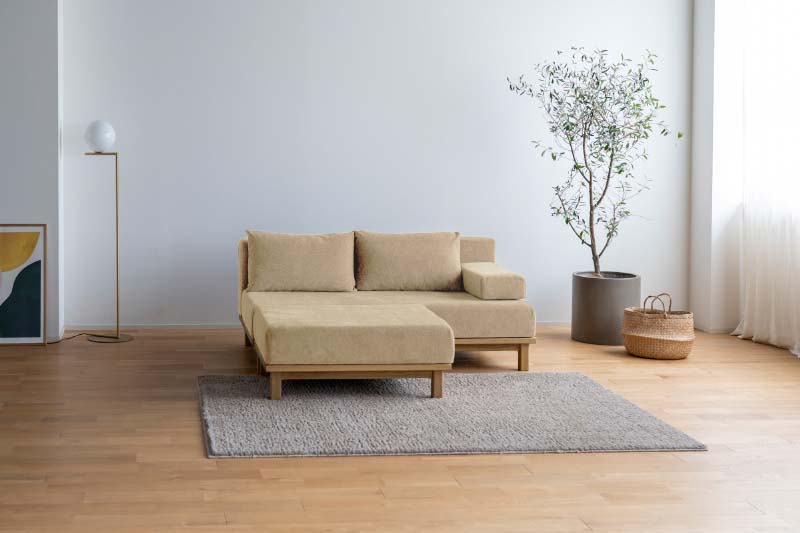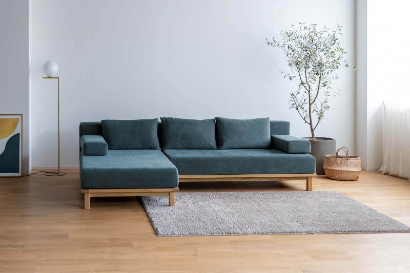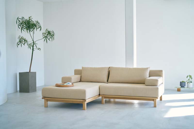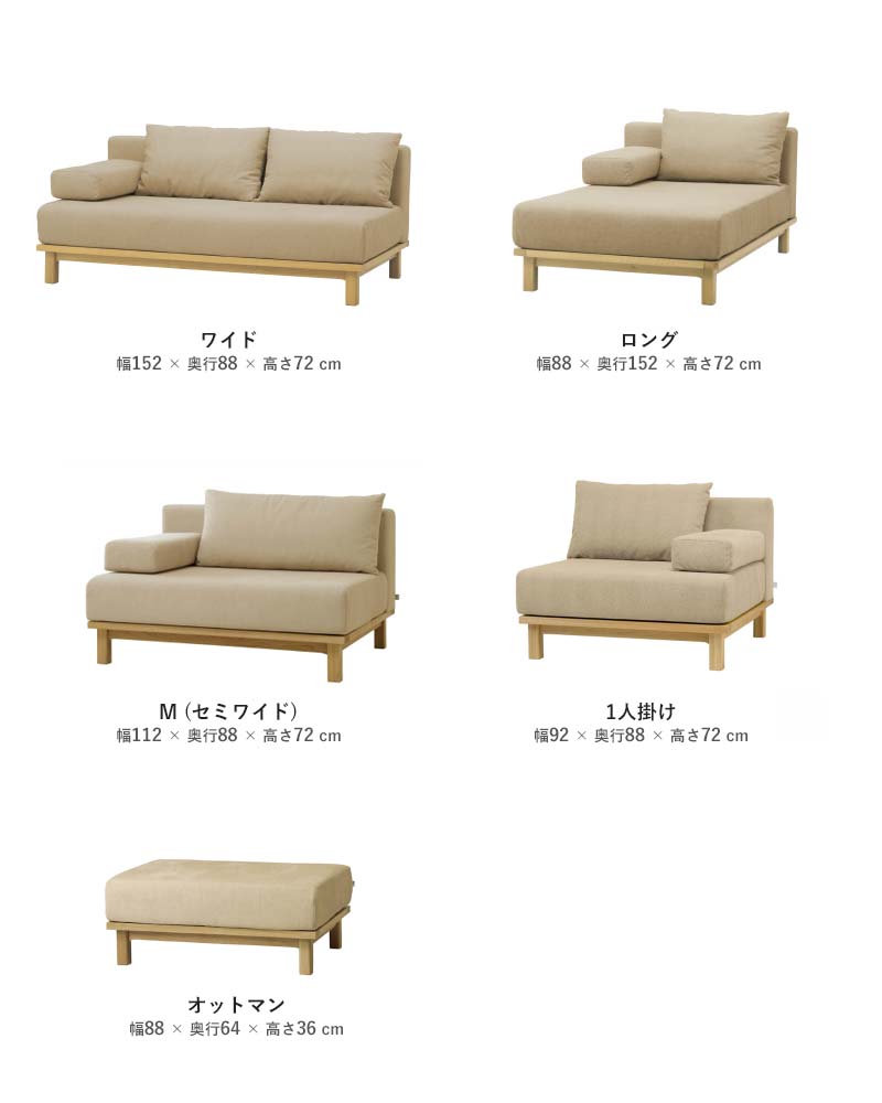 幅、奥行きの異なる4サイズ+オットマンの展開のユニットソファです。1シーター、ロング、M(セミワイド)タイプには背クッション1個、肘クッション1個、ワイドタイプには背クッション2個、肘クッション1個が付属しており様々な配置が可能です。カバーは表面を毛羽立たせた、ふんわりとした可愛らしい生地(ポリエステル100%)。基本の色は4色からお選びいただけ、カバーリング仕様なので色を変えて楽しんだり、汚れたら外して拭き取ったり、ドライクリーニングでお手入も可能です。木部は木の質感を感じていただけるオイル仕上げ。小さな傷は研磨して補修し、オイルを塗布してメンテナンスすることで、綺麗な状態を長く楽しんでいただけます。傷やへこみにも強い無垢材は使い込むほどに風合いが増します。天然木の特徴でもある、木目や節など、二つと同じもののない個性をお楽しみください。