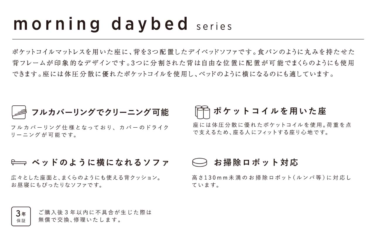 ポケットコイルマットレスを用いた座に、背を3つ配置したデイベッドソファ。食パンのように丸みを持たせた背フレームが印象的なデザインです。3つに分割された背は自由な位置に配置が可能で、まくらのようにも使用できます。座には体圧分散に優れたポケットコイルを使用し、ベッドのように横になるのにも適しており、お昼寝にもぴったりなソファです。