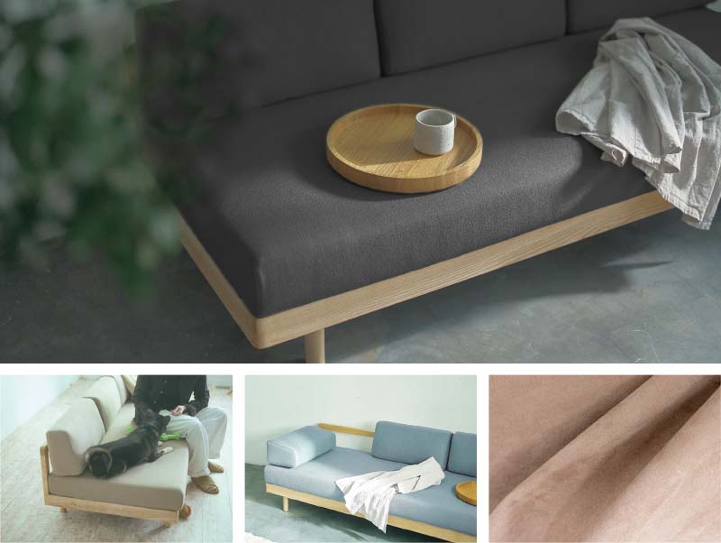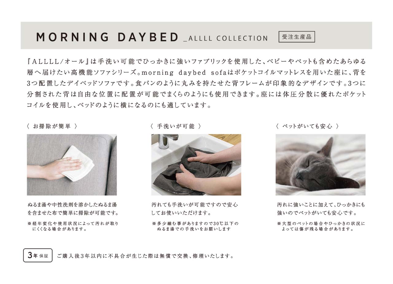 SIEVEのモーニングデイベッドソファをALLLL生地仕様にしました。フレームにはアッシュ無垢材を贅沢に用い、食パンのように丸みを持たせた背フレームが印象的なデザインです。3つに分割された背は自由な位置に配置が可能でまくらのようにも使用できます。座にはポケットコイルを使用し、ベッドのように横になるのにも適しています。