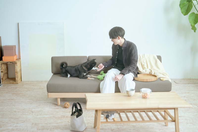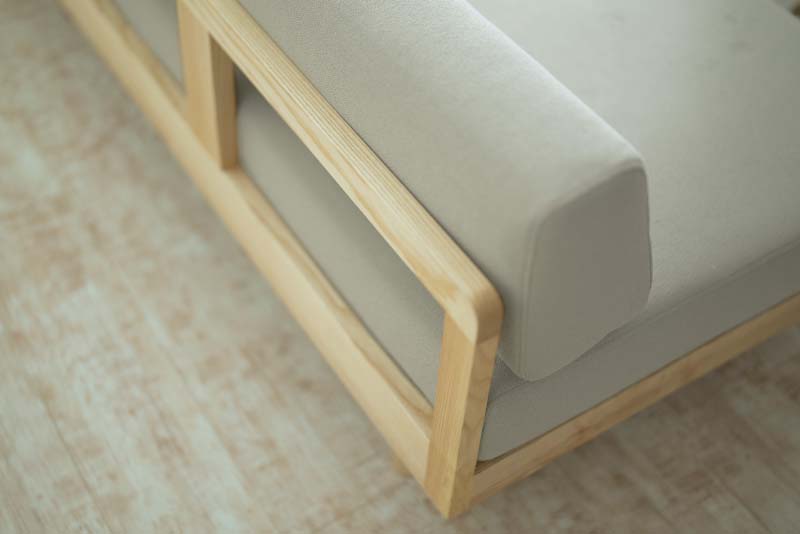 フレームにはアッシュ無垢材を贅沢に用い、食パンのように丸みを持たせた背フレームが印象的なデザインです。