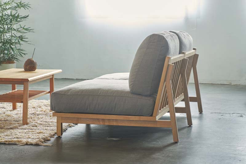 後姿が印象的なアッシュ無垢材フレームと、フェザーをふんだんに使用した背と座クッションが魅力的なローソファです。