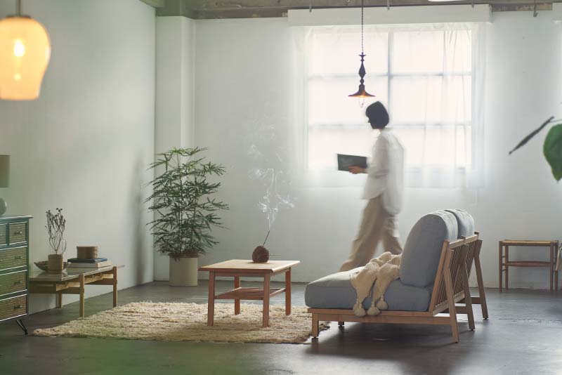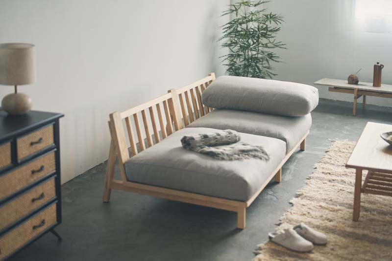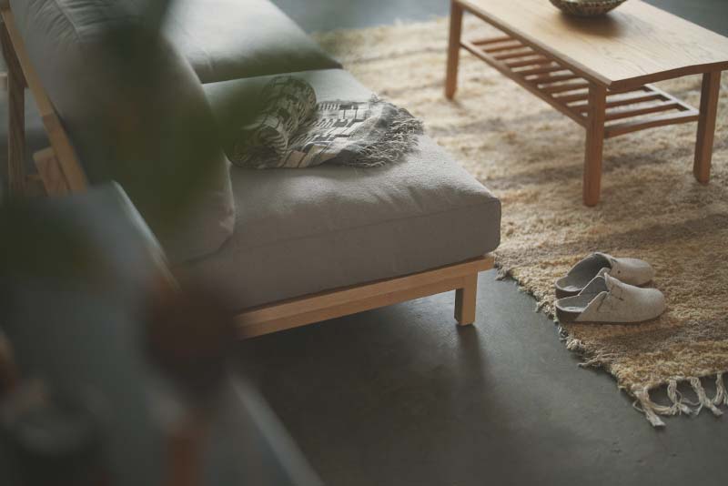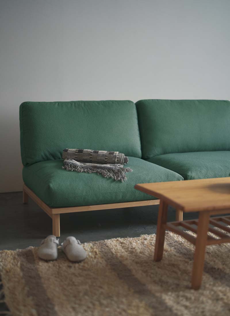 後姿が印象的なアッシュ無垢材フレームと、フェザーをふんだんに使用した背と座クッションが魅力的なローソファです。細部に丸みを持たせた格子状の背と、優しさを感じる脚フレームが様々なインテリアにマッチします。座は奥行きが十分にあり、寝転んだり座面の上であぐらをかいて座ったりするのにも適しています。背クッションは枕のようにも使用できます。