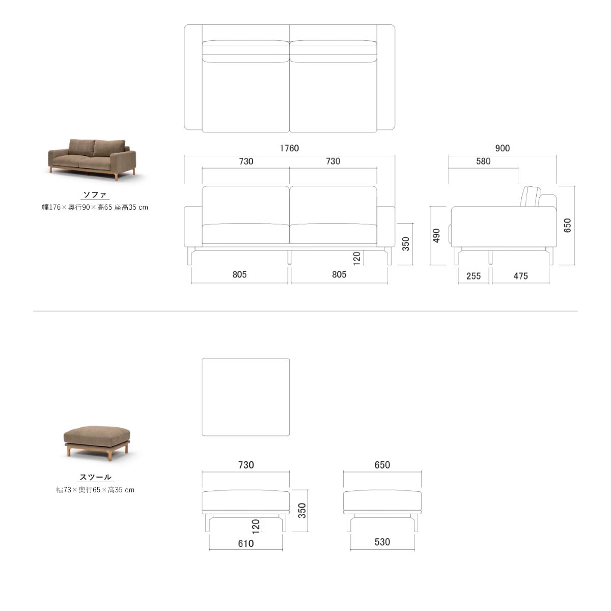 ソファ : 幅176×奥行90×高65 座高35 cm (背クッション無し高さ 55cm)