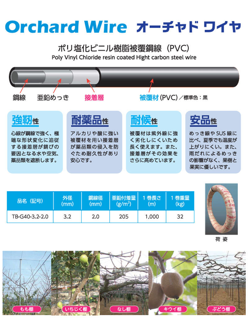 オーチャドワイヤ TB-G40-3.2-2.0 1000m 1巻重量 32kg 外径3.2mm 鋼線径 2.0mm 果樹棚 桃 イチジク 梨 キウイ ぶどう 片山鉄建 カ施 個人宅配送不可 代引不可