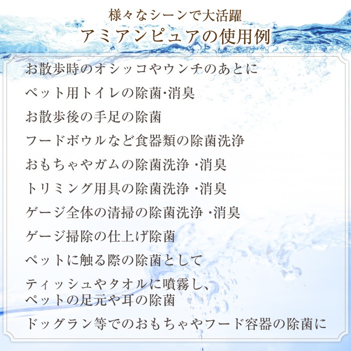 ・お散歩時のオシッコやウンチのあとに・ペット用トイレ・お散歩後の手足・フードボールなどの食器類・おもちゃガム・トリミング用具・ゲージ掃除の仕上げ・ペットに触る際・ティッシュやタオルに噴霧し、ペットの足元や耳の洗浄に。