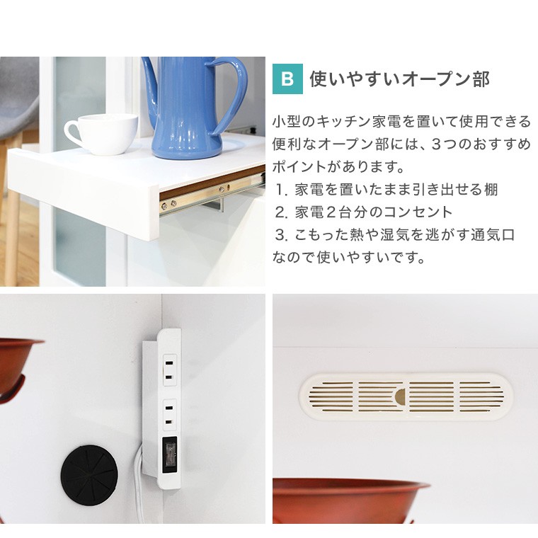 ジャストな70サイズで使い勝手抜群のキッチン収納。スライド棚とコンセントの付いたオープンスペースが2ヶ所、食材のストックなどの収納に便利な深さのある引き出し、棚板が3枚付いた扉内収納と、使いやすさを凝縮したキッチン収納です。