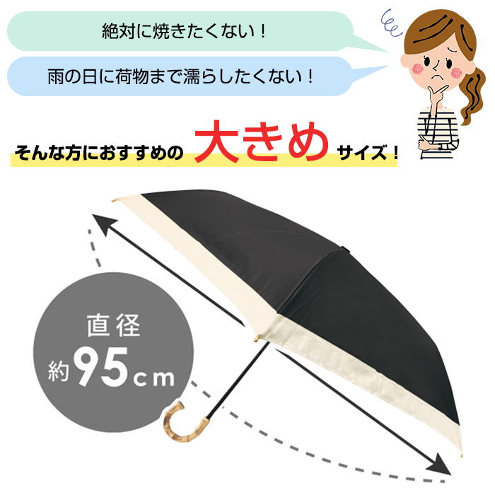 親骨55cm・直径約95cmのゆったりめなので、絶対に肌を焼きたくない!荷物を濡らしたくない!…そんな方におすすめです。