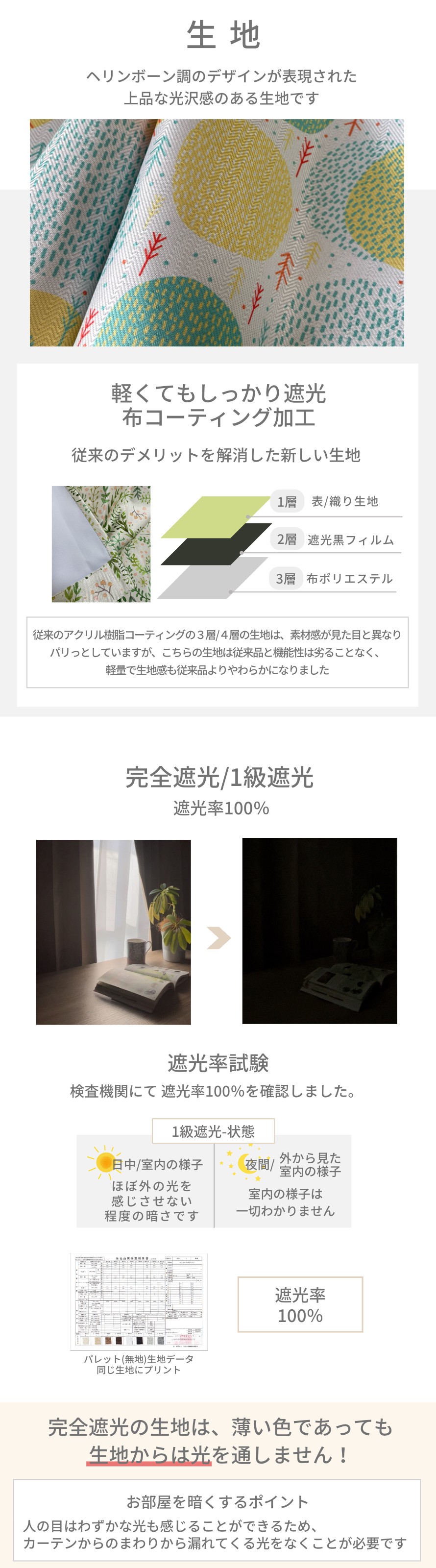 薄い色でも生地から光を通すことがない、完全1級遮光カーテン(遮光率100%)