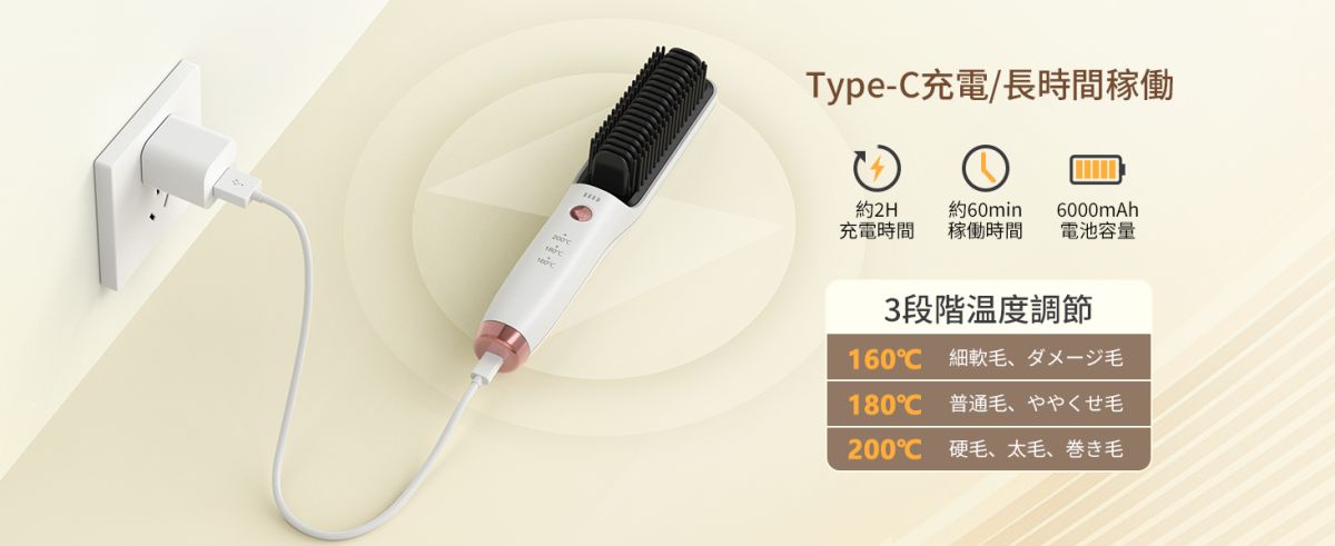 【USB充電式でコードレス】本コードレスヒートブラシはバッテリー容量を増量し6000mAhまでの大容量電池を搭載しており、最長60分間も持いて、充電してコードレスでいつでもどこでもヘアセット。一回のフル充電で約60分※使用可能。(※環境や使用条件で、使用できる時間が短くなることがあります。)