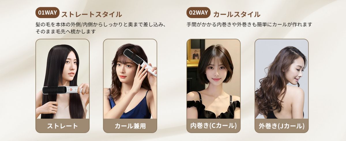 【ストレート&ワンカール兼用するヒートブラシ】このヒートブラシは、ストレートとカールの2つのスタイリング方法を実現し、ブラッシング感覚で時短にスタイリングできますので、初心者にもすぐに使いこなせます。細軟毛・ダメージ毛・硬毛等様々な髪質に合わせて、3段階温度調節(160℃、180℃、200℃)で髪の状態やスタイリングのニーズに合わせられます(160℃:細くてダメージの少ない髪や柔らかい髪;180℃:一般的な髪質や普通のヘアスタイル;200℃:太くて硬い髪やクセの強い髪)。ストレート&カール2way仕様のブラシアイロンなので、髪全体のスタイリングを1本で完結します。
