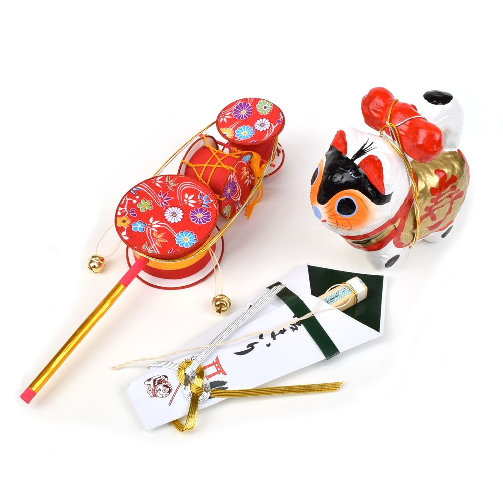 お宮参りの際には麻の紐をお祝い着の紐にしっかりと結び、お守り・でんでん太鼓・犬の張り子などの縁起小物と共に吊るします。