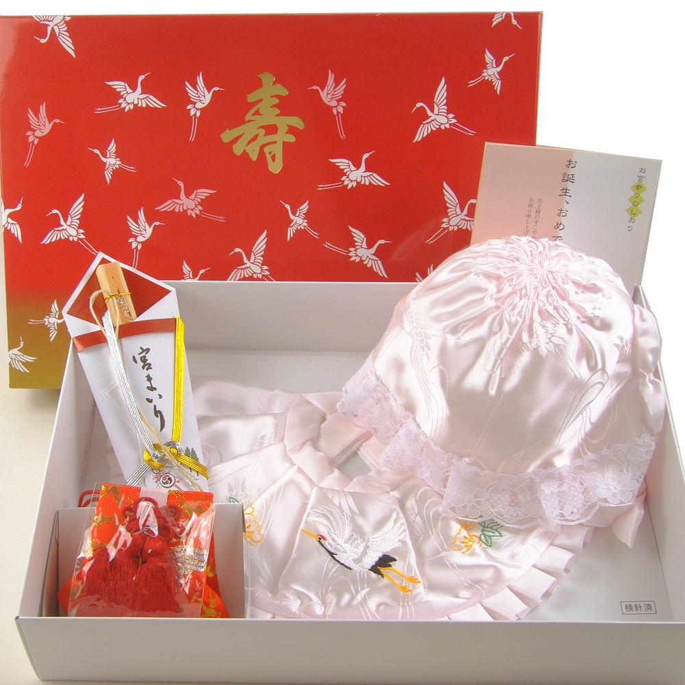 お宮参り よだれかけ 帽子 4点セット 箱なし フードセット 初着 産着 日本製 ピンク