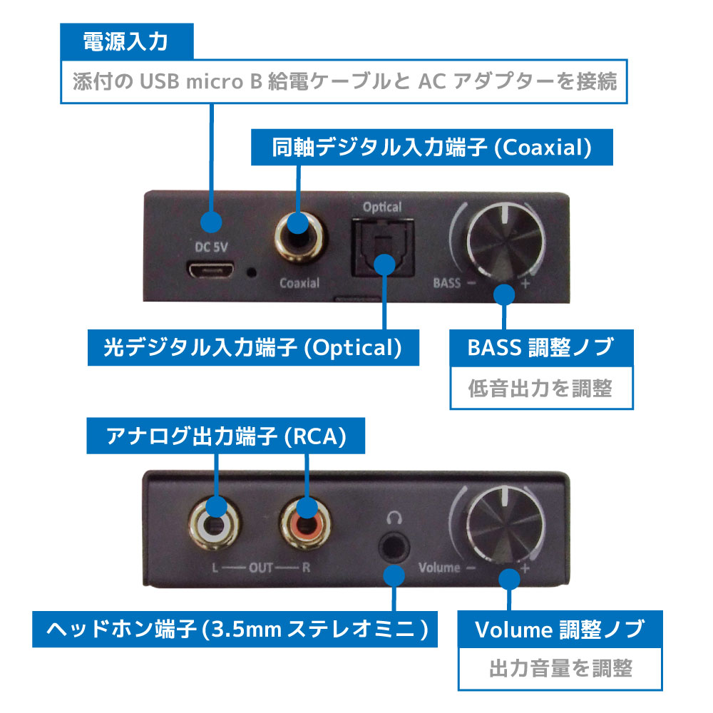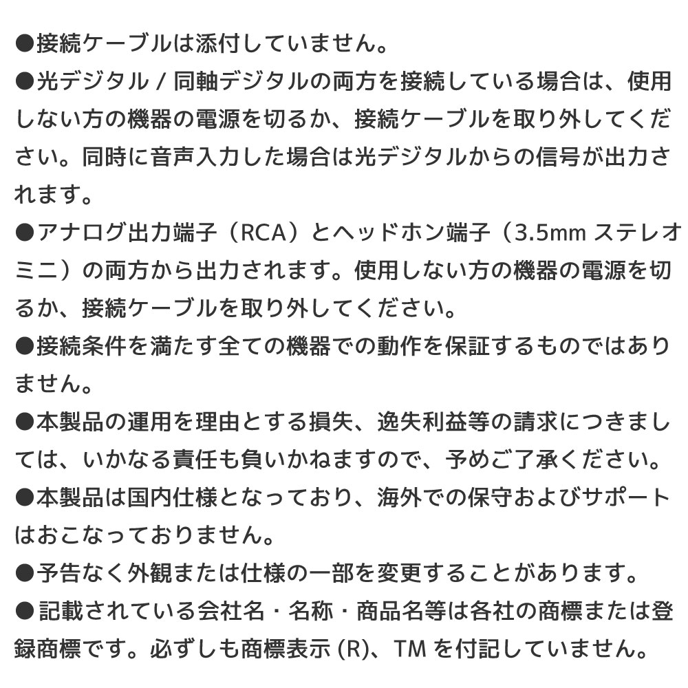 「光デジタル・同軸デジタル出力端子をもつ機器」から「アナログ(RCA)・ヘッドホン(3.5mmステレオミニ)入力端子をもつ機器」に音声出力が可能。