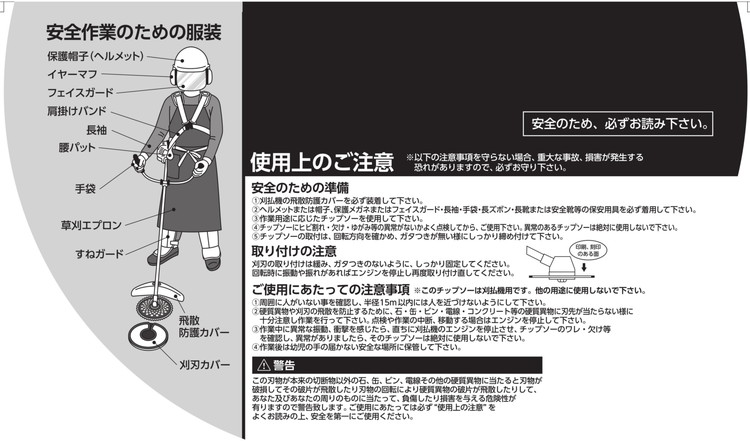 安全カバー、安全靴、保護メガネなどをご使用ください。作業中に異常な振動・衝撃を感じたら直ちにエンジンを停止してチップソーのヒビ割れなどの確認をしてください。摩耗により切れの悪くなったチップソーは新しいものに取り換えるか、適正な目立てを行ってください。