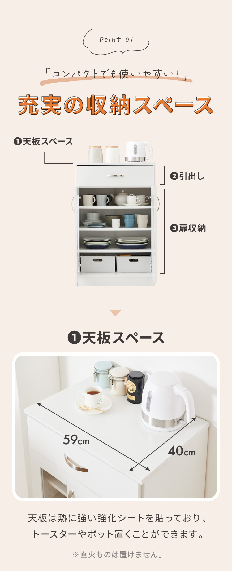 天板は熱に強い強化シートを貼っていますのでトースターやポットを置くことができます(直火ものはNGです)。