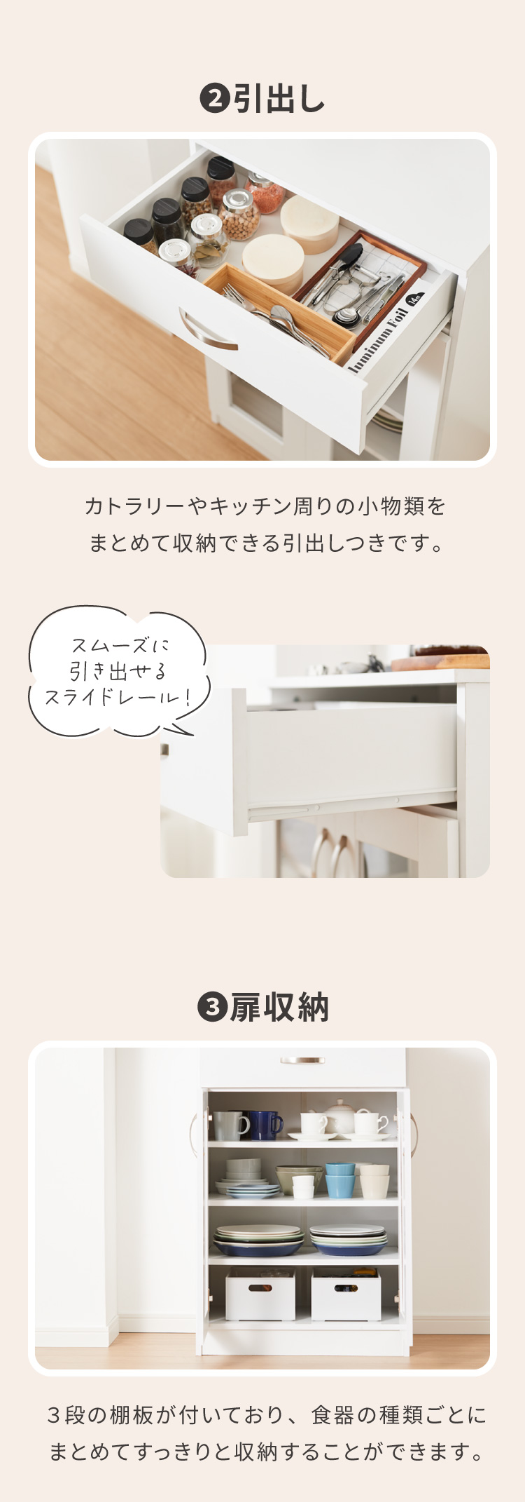 扉を開けたら棚板3枚の4段構成 棚板は食器に合わせて高さが調整可能です。