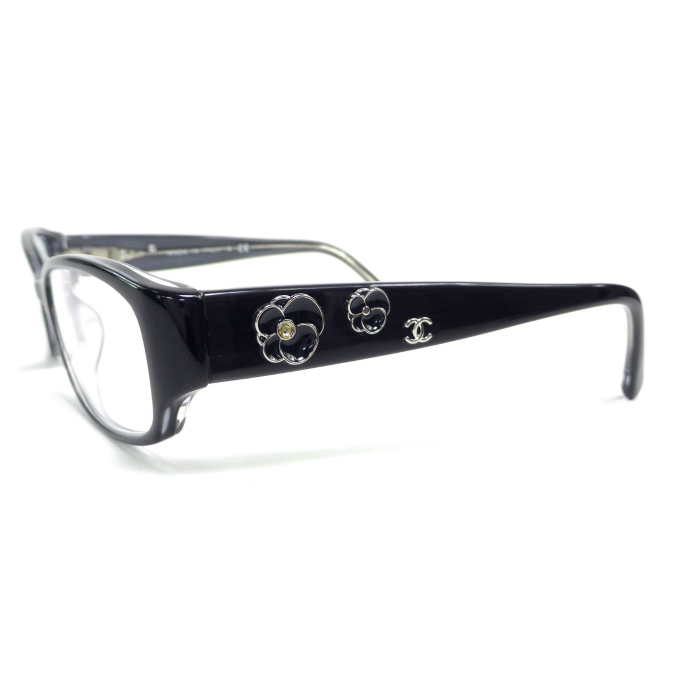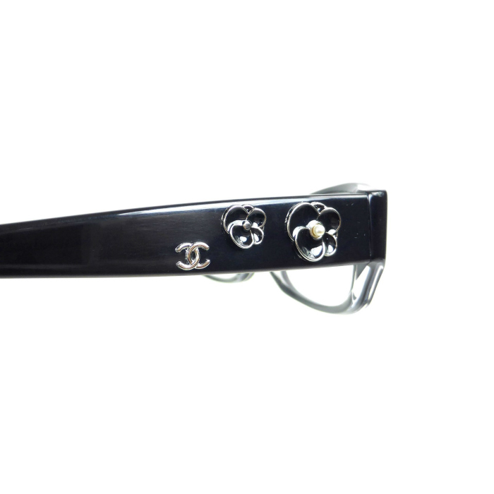 アイコンであるカメリアのモチーフがサイドにあしらわれた、シャネルのエレガントなメガネフレーム。