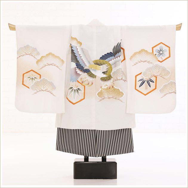 d4317(「高級正絹」京友禅 白地に金彩螺鈿の飛翔鷹/小さめ5歳男児/七五三)