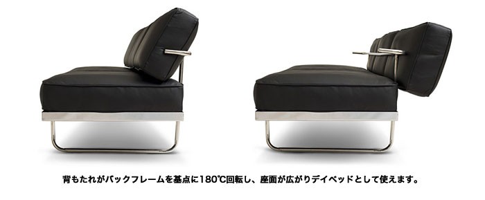 ル・コルビジェ自身が昼寝用で個人的にデザインしたソファだけあり、背もたれがパイプに沿って後方へ回転し、デイベッド(DAYBED)としても使えるよギミックが採用されています。