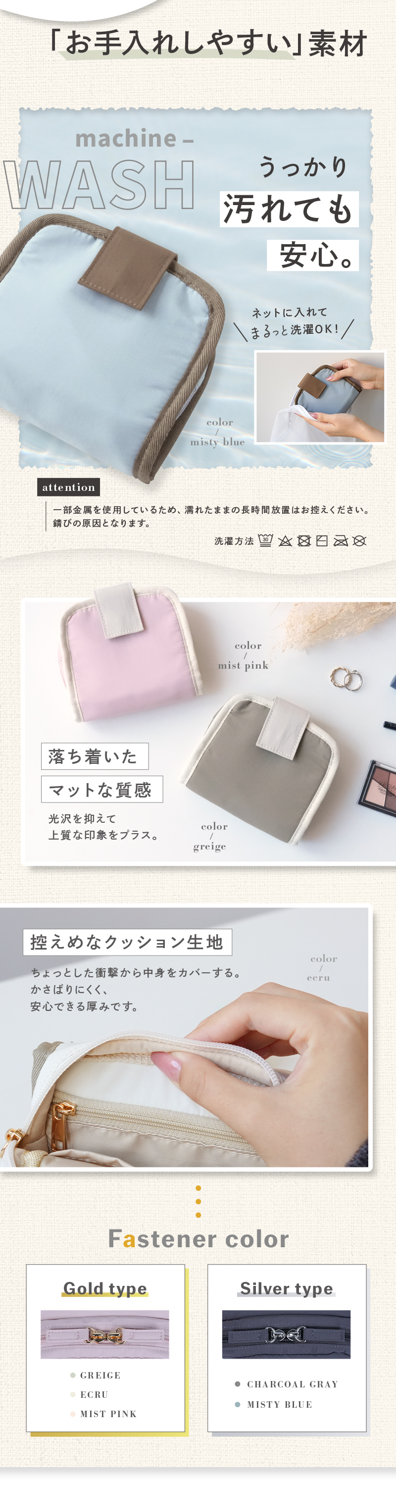 ポーチ 本体をまるごと 水洗い できるので、いつでも清潔をキープできます。