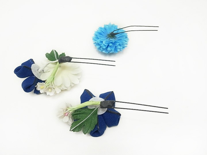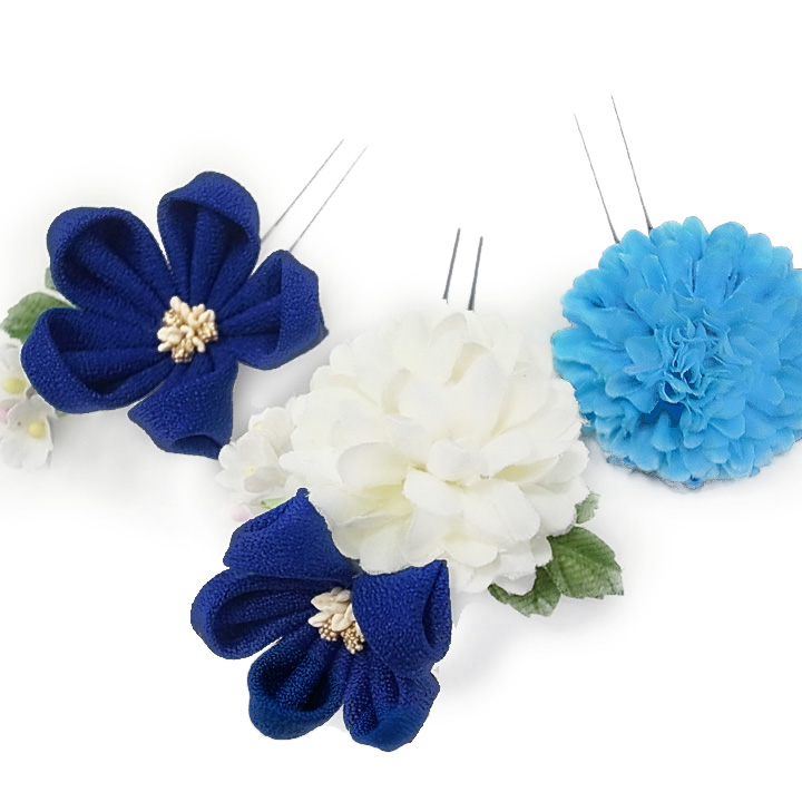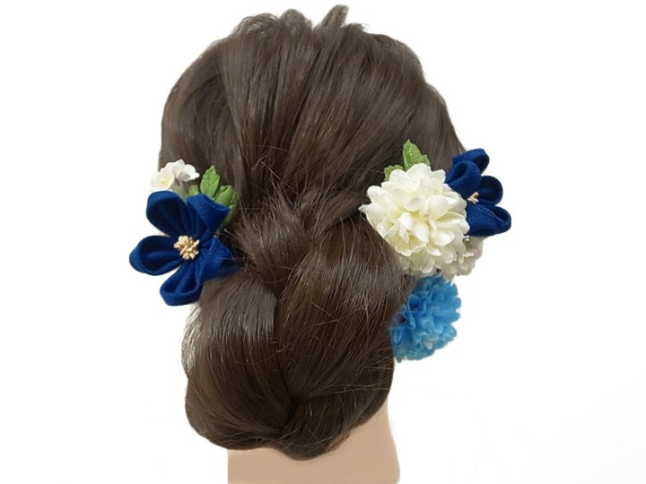 髪飾り 成人式 振袖 袴 3点セット 青色 オフホワイト 大人 浴衣 かんざし 簪 卒業式 フォーマル 結婚式 花飾り つまみ細工 リボン ちりめん ブライダル W 髪飾り 303-210 青 m837 WSi