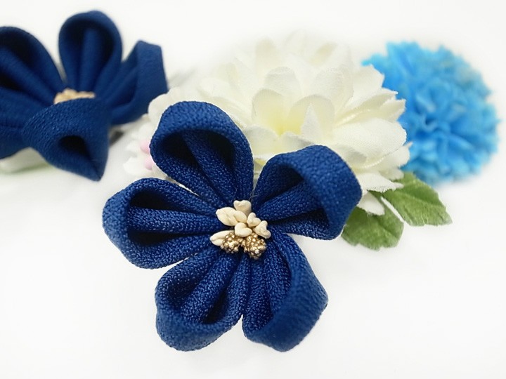 上品な青を基調としたつまみ細工の花髪飾りです。