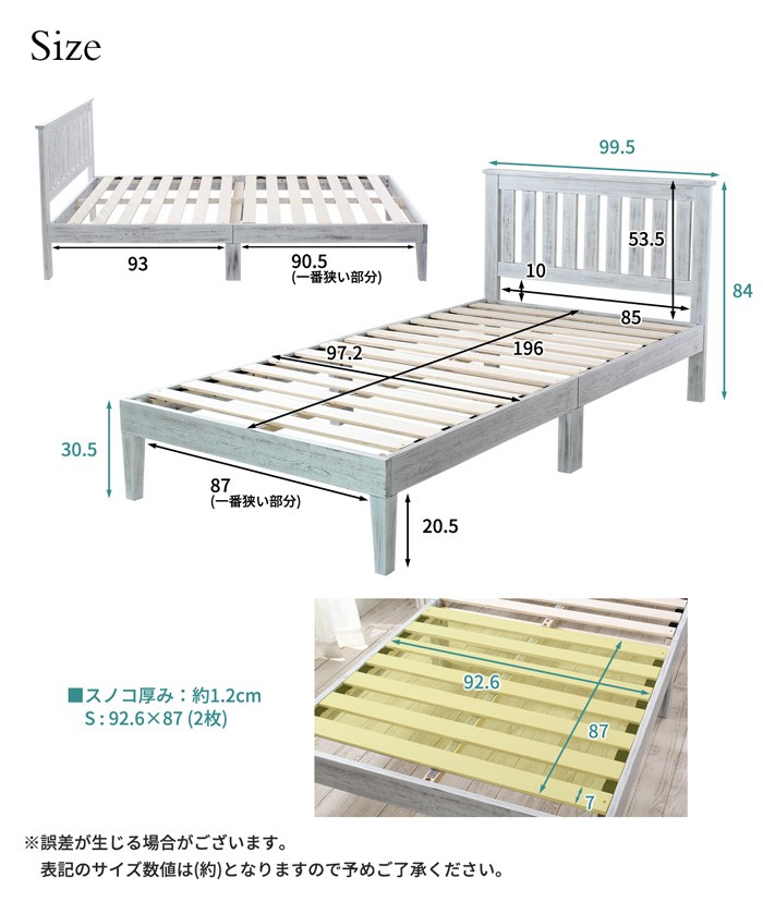 ベッド シングル S すのこベッド ヘッドボード付き ベッドフレーム シャビーシック ホワイト パイン材 Charles/シャルル フレームのみ
