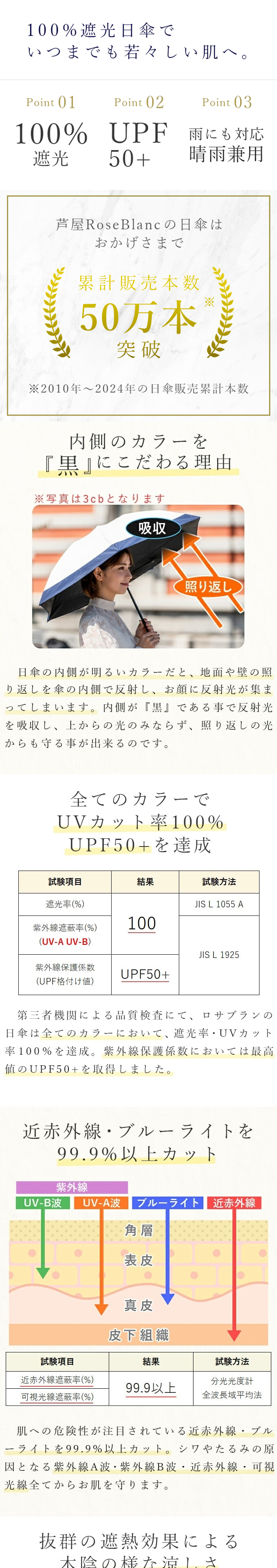 機能性とファッション性を追求当社で使用している生地は遮光率はもちろんのこと、内側のブラックラミネート加工が照り返しからお肌や眼を守り、お洒落にもこだわっています。濡れたり汚れたり摩擦しても遮光率は落ちず、生地が破れない限り遮光性能をキープします。