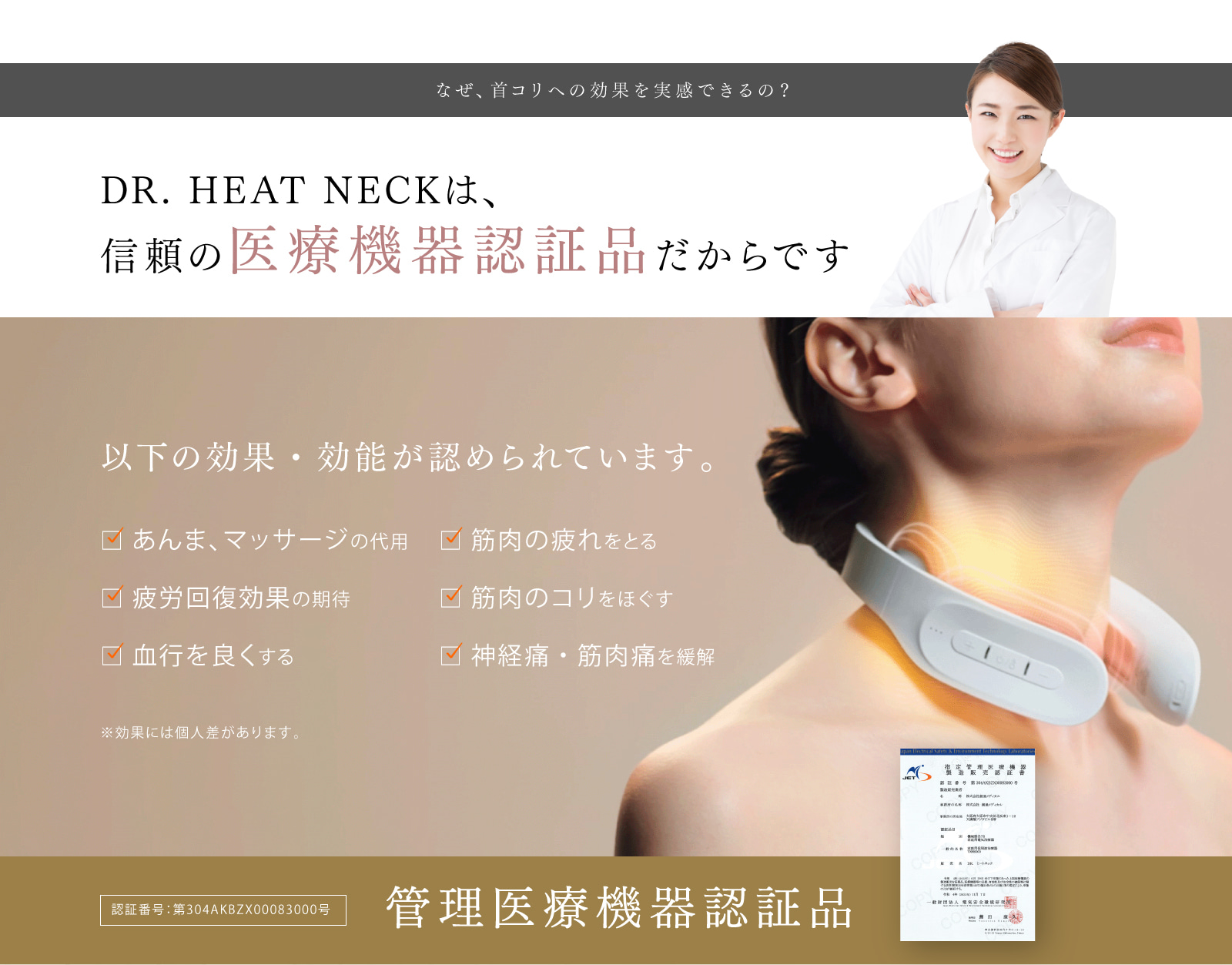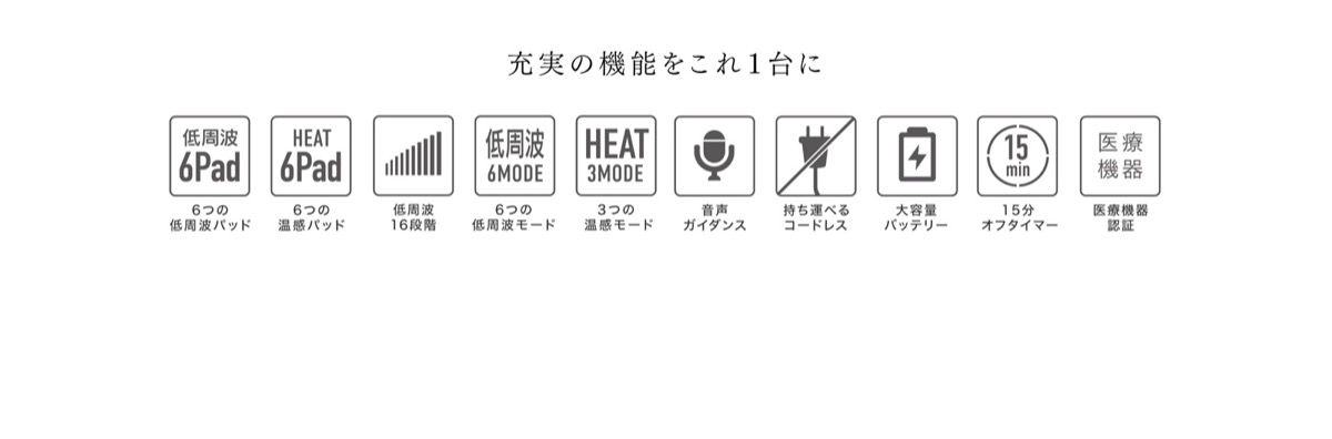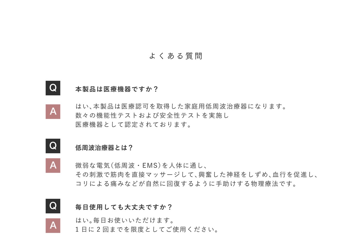 ※医療機器認証済みの本格的な家庭用治療器のため、肩こりの緩解、麻痺した筋肉の萎縮の予防およびマッサージ効果(一般家庭で使用すること)として、効果の表示が認められています。