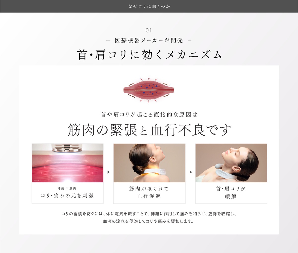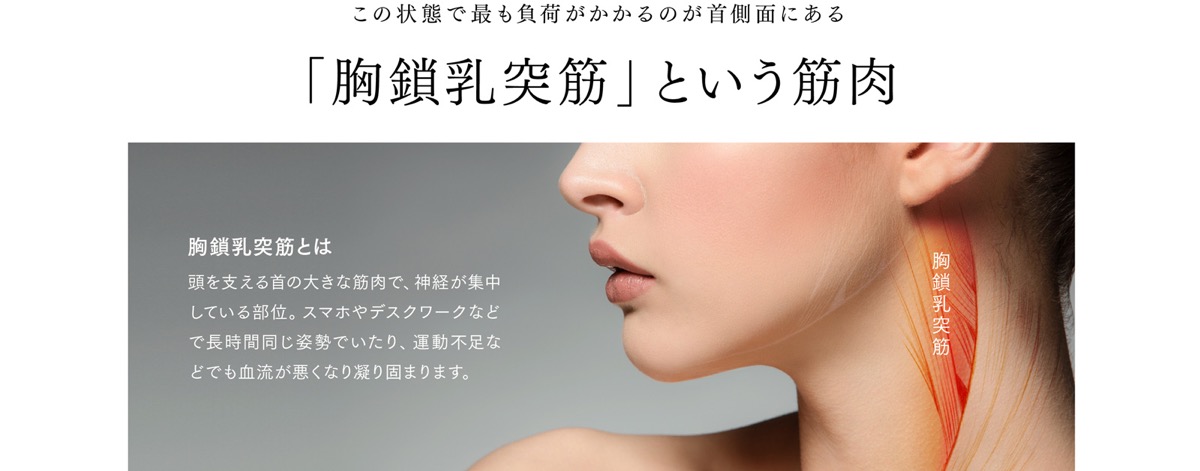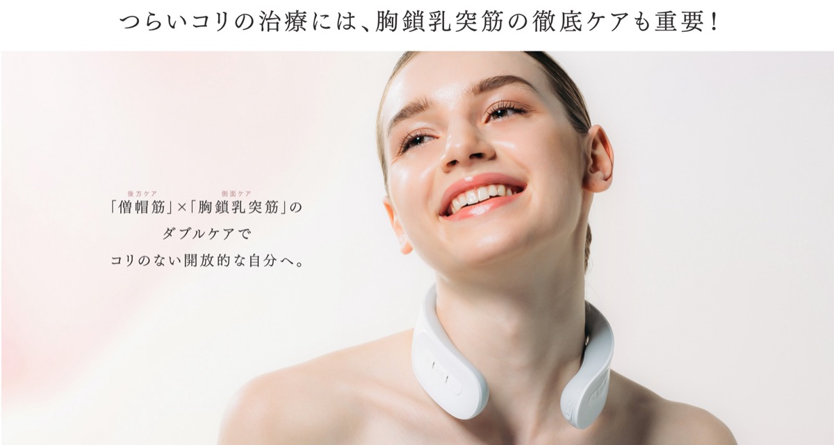 筋肉を効率的に収縮することで、首・肩まわりの血行を促進し、コリや痛みを緩和します。