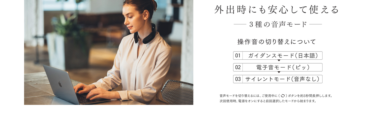 外出時にも安心して使える、3種類の音声モード搭載。