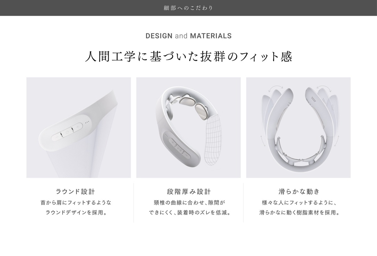 首から肩にフィットするようなラウンドデザインを採用。