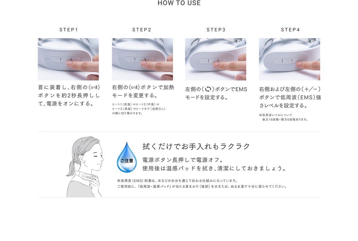 ご使用前に、「低周波・加熱パッド」が当たる首まわりを水またはぬるま湯で十分に湿らせてください。