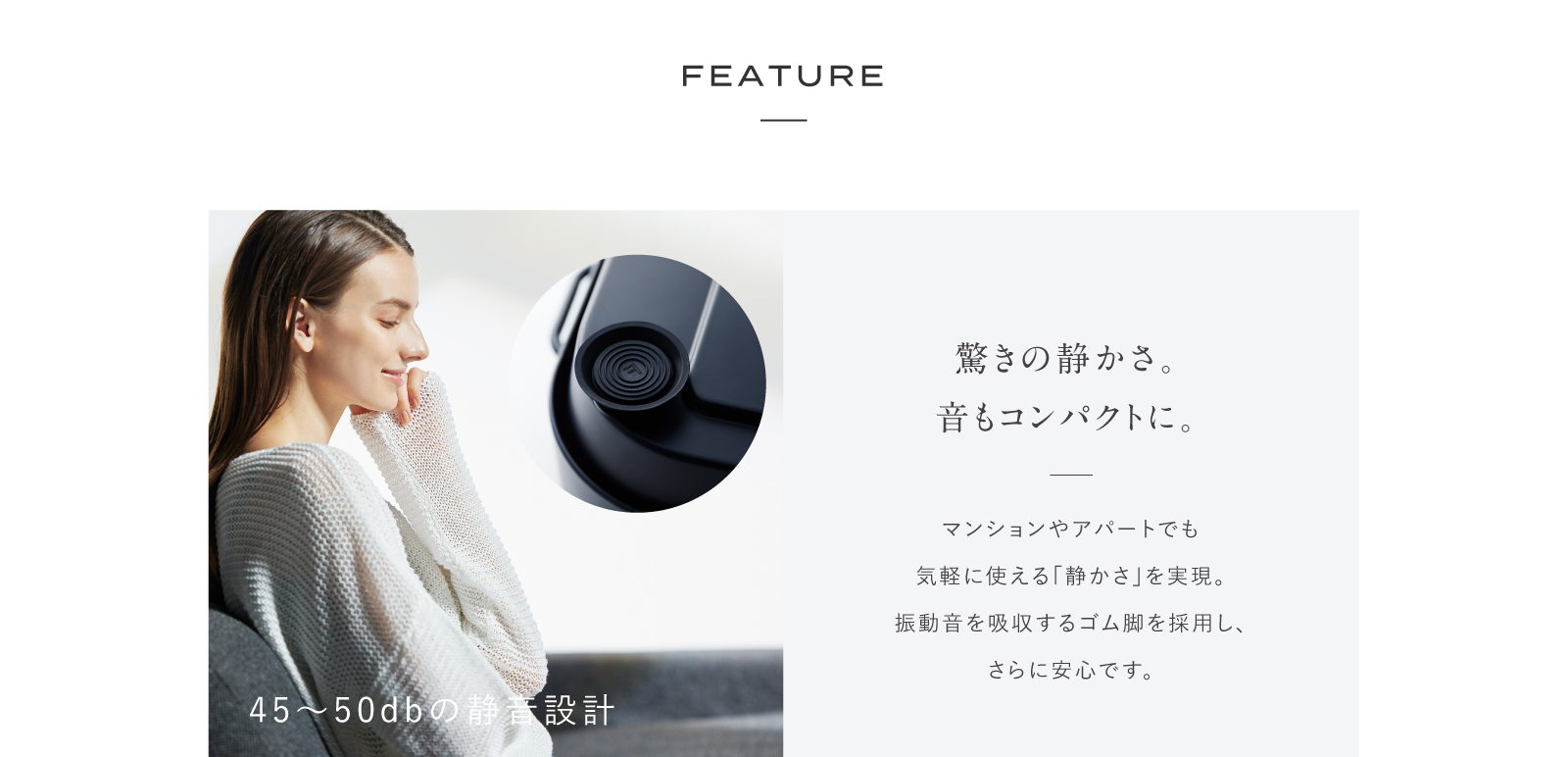 マンションやアパートでも気軽に使える「静かさ」を実現。振動音を吸収するゴム脚を採用し、さらに安心です。