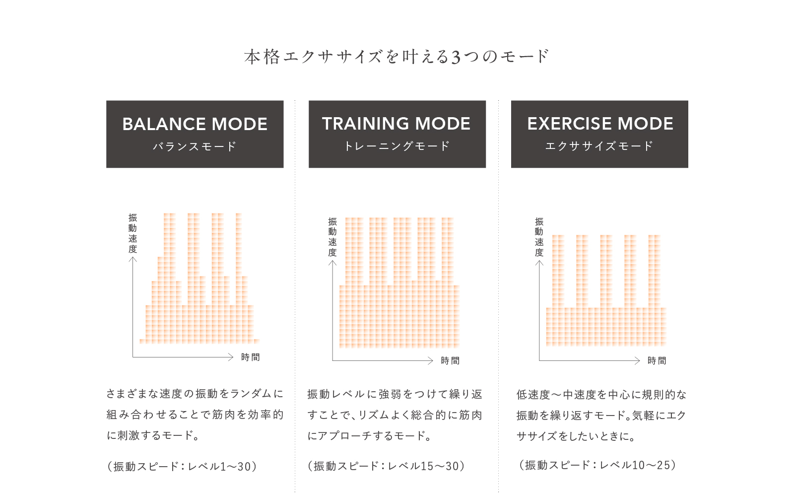 低速度〜中速度を中心に規則的な振動を繰り返すモード。気軽にエクササイズをしたいときに。