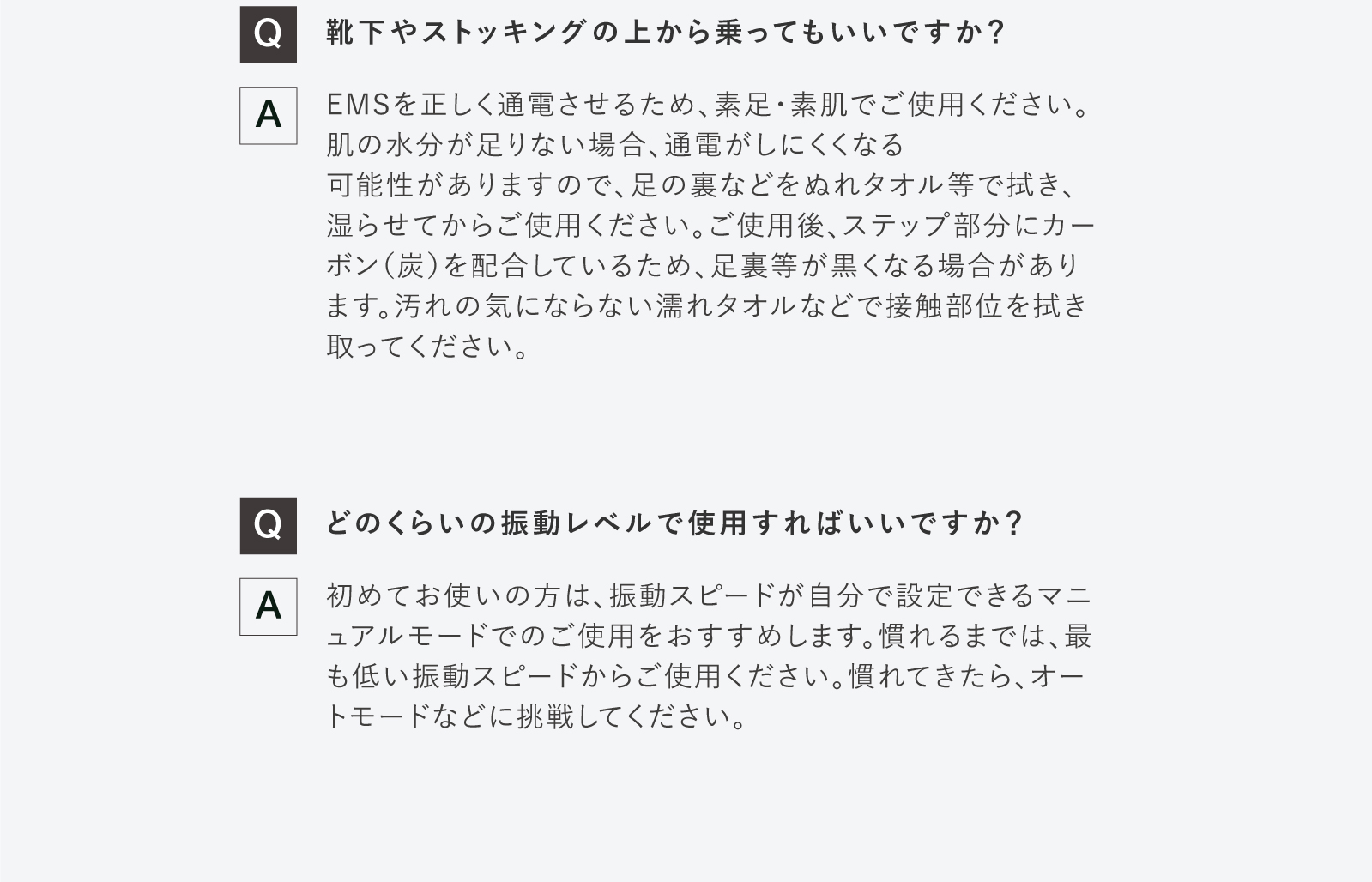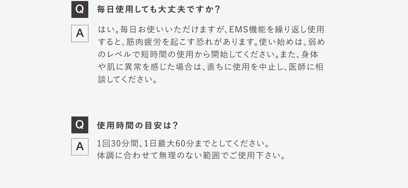 ・初めてEMS機能を使用するときには、刺激に慣れるまではイスに座るなど安定した姿勢で行う。