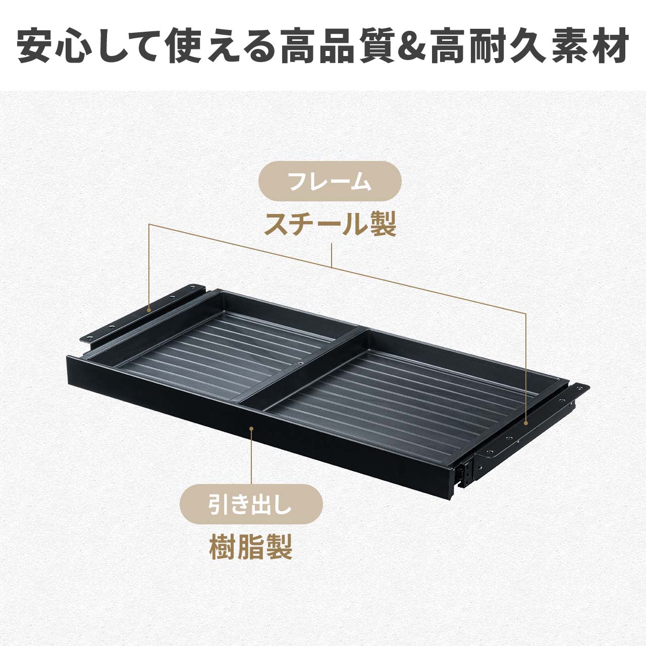 デスク下に収納スペースを増設するための引き出しで、在宅ワークや昇降デスク、リビングデスクでの小物整理に適しています。収納が少なく散らかりやすい課題を解消し、文房具やA4書類を分けてすっきり保管できます。2分割構造とスムーズなレールにより出し入れも快適で、既存デスクへ簡単に後付けできます。