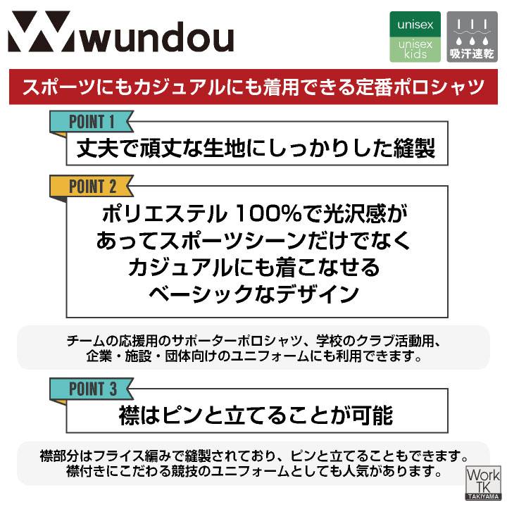 wundou P115 タフドライポロシャツ スポーツにもカジュアルにも着用できる定番デザイン。 襟はしっかりとした縫製でピンと立てることが可能。 吸汗速乾 男女兼用 ・モニターにより実際の色と多少ちがって見えることがあります。人気商品のため、商品在庫が欠品することがあります。