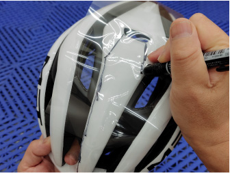 保護フィルムをヘルメットの施工エリアにあてて、油性マジックで切り取る形状の型を取ります。