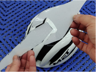本製品はフリーカットで使用する350mm×420mmという大判サイズなので、ヘルメットやフレームなど大きめな面積の施工にうってつけです。