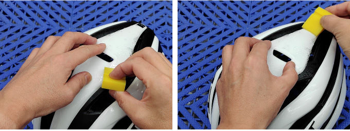 ゴミなどが混入しないようにヘルメットの施工面をキレイにしたら、ヘルメットとフィルムの粘着面に施工液をたっぷり噴き掛けます。