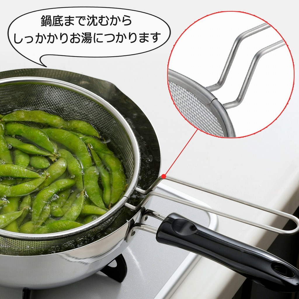 鍋にザルをセットして、茹で上がったらそのままサッと引き上げるだけで水切り完了。ハンドルが鍋ふちに当たらない形状だから、ザルがお湯にしっかり浸かって茹でムラもありません。