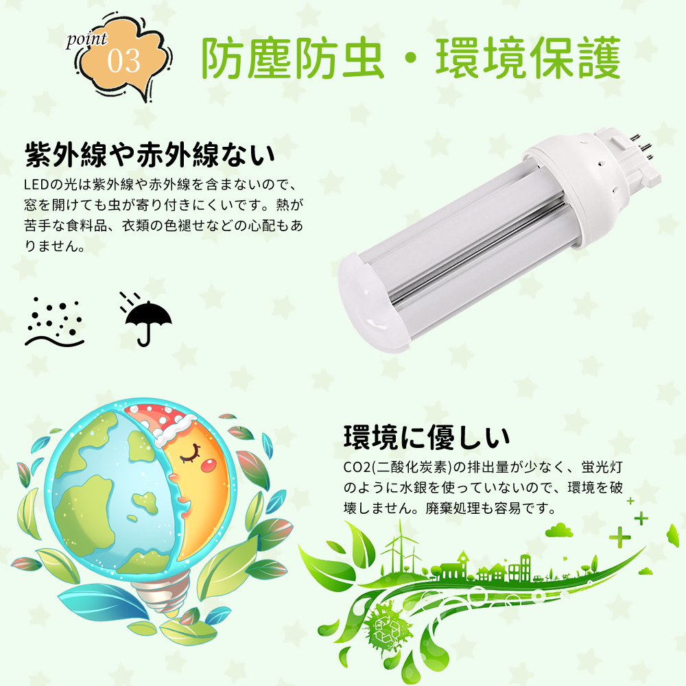 すべてリサイクル可能(有害物質を含みません)、無毒、無味のエコ材料で環境にやさしい,紫外線が少ないので、人体も優しい。LEDライトの波長を嫌い、ライトカバーも虫・塵ガードの密着構造になっているため、虫が寄り付けにくい。割れにくい安全性 素材がガラスではないので、落下しても割れにくい安全性。