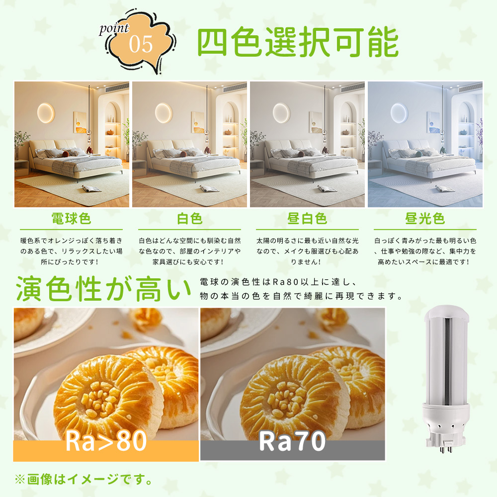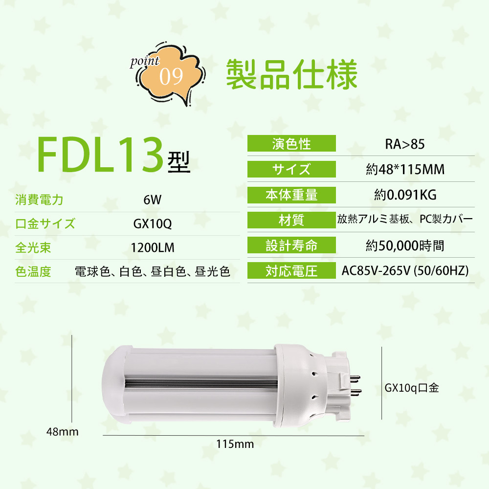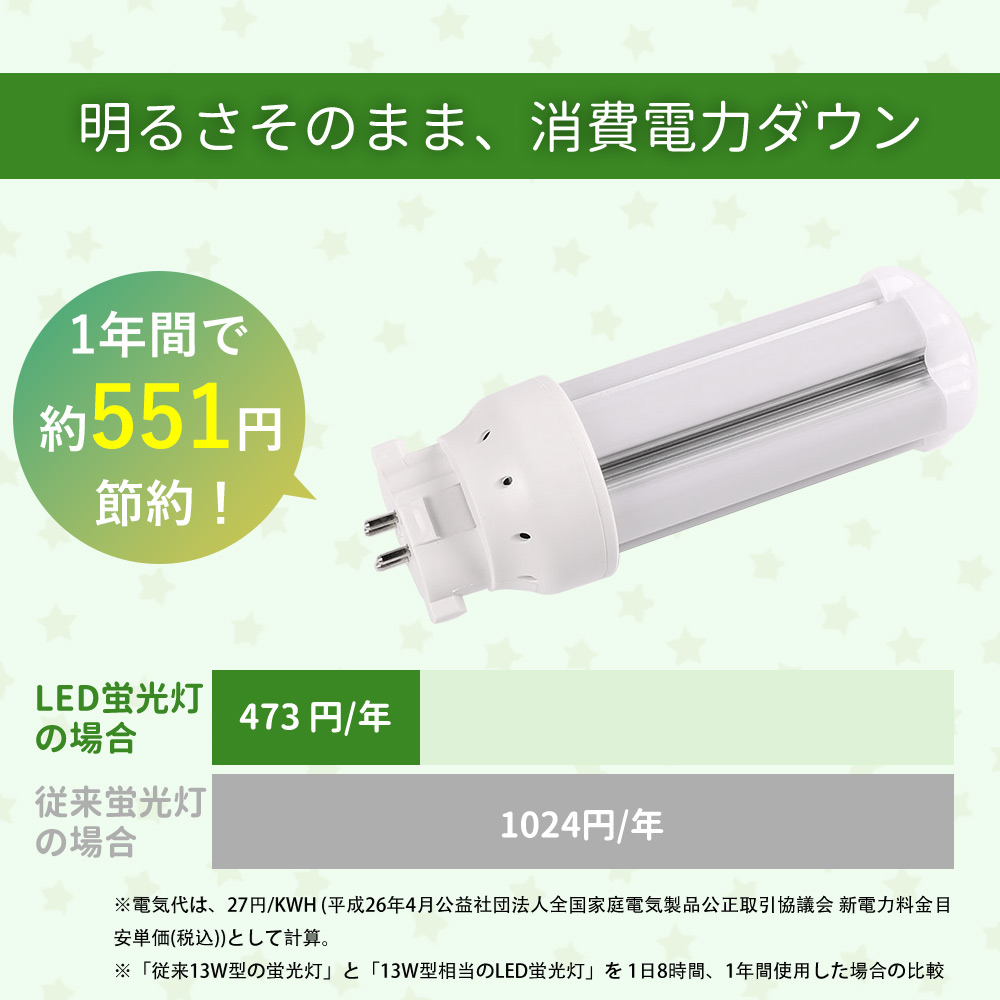 50000Hの長寿命で、従来のコンパクト蛍光灯に比べ、交換作業が大幅に省けます。6Wの消費電力で従来の蛍光灯FDL13Wの明るさを提供でき、省エネ性に優れています。