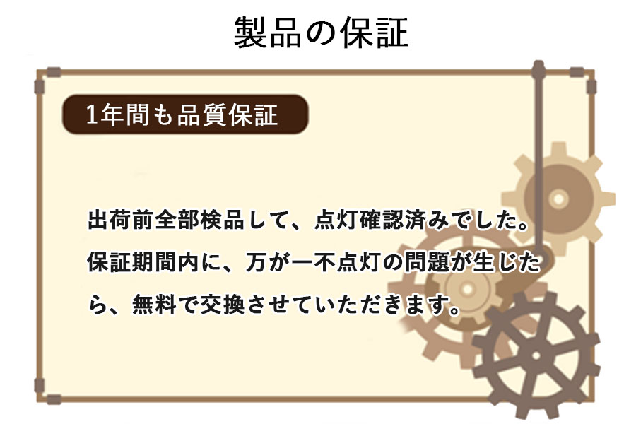 出荷日から1年間で何か故障が御座いましたら、無料で修理や交換をさせていただきます。